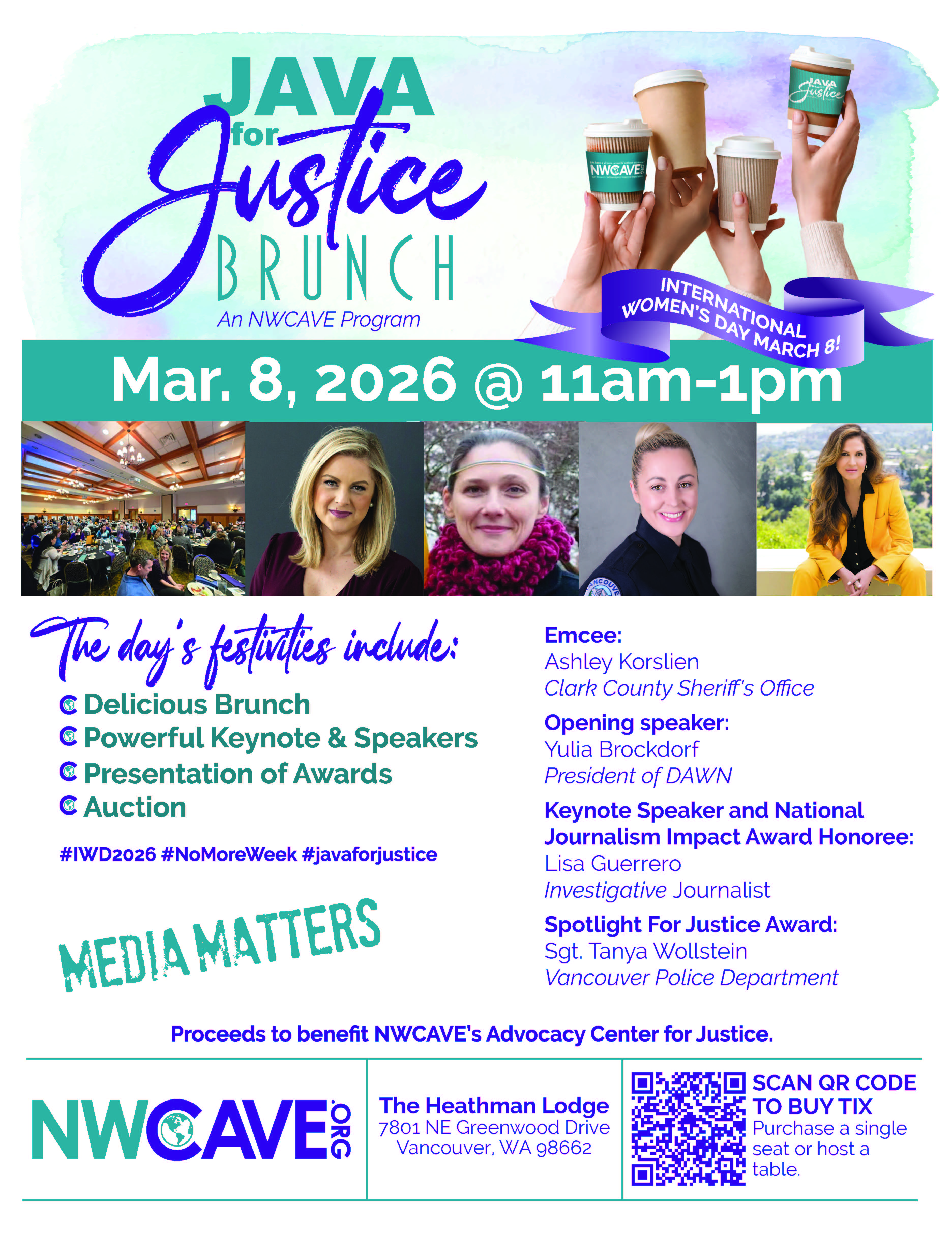 Our #NWCAVE Java For Justice Brunch will take place Sunday, March 8, 2026 on International Women's Day! #IWD2026 #NoMoreWeek #javaforjustice.